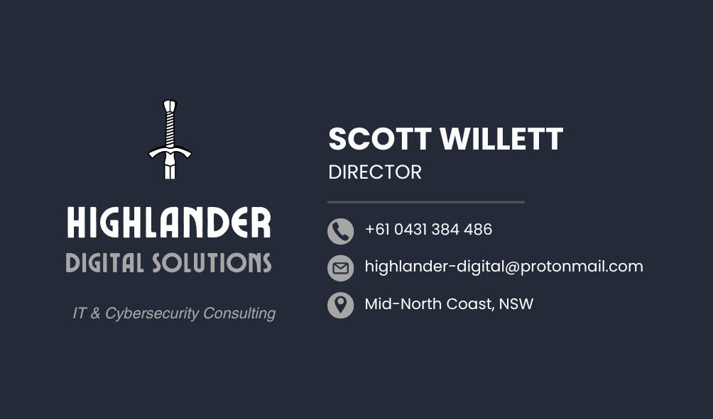 Highlander Digital Solutions is your friendly local team on the Mid-North Coast of NSW for all things computer, tech, and cybersecurity - whether it’s fixing issues, setting up systems, or keeping your data safe and secure so you don’t get hacked.At Highlander Digital Solutions, you get:* Real Help: You speak to someone who’s not only skilled and experienced but also genuinely enjoys solving your problems and cares about your concerns. Great customer service is at the heart of what we do.* Transparency: We’re upfront about our costs and the work involved, and encourage you to verify this yourself (even with AI 😉). You’ll always have options on how you want to engage with us and move forward.* Trust: We do right by you. Unlike most providers, we write clear documentation for any work we do and hand it over to you. This makes it easy to switch providers if you ever want to - because we don’t believe in locking you in. If we do a good job, you’ll come back to us.* Value for Money: We deliver practical, cost-effective solutions tailored to your needs, giving you pricing options and clear scopes of work upfront. That way, you get real results without paying for fluff or unnecessary extras.